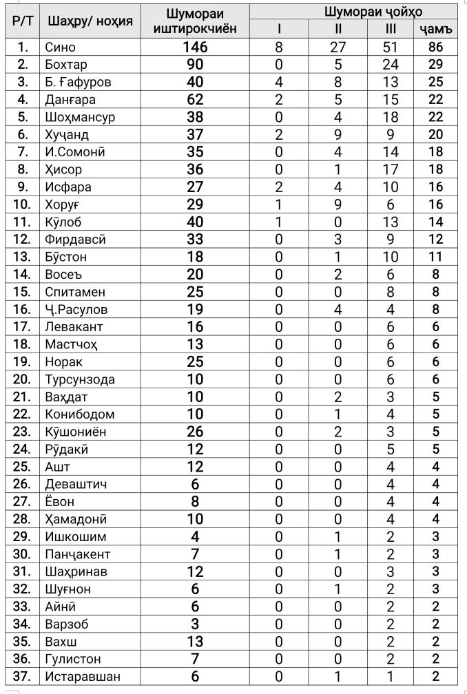 Ҷамъбасти озмун маълум намуд, ки хонандагони ноҳияи Сино бо гирифтани 86 ҷойи ифтихорӣ (8 медали тилло, 27 медали нуқра ва 51 медали биринҷӣ) ҷойи якум, шаҳри Бохтар бо гирифтани 29 ҷойи ифтихорӣ (5 медали нуқра ва 24 медали биринҷӣ) ҷойи дуюм ва ноҳияи Бобоҷон Ғафуров бо гирифтани 25 ҷойи ифтихорӣ (4 медали тилло, 8 медали нуқра ва 13 медали биринҷӣ) ҷойи сеюмро ишғол намуданд. Хонандагони муассисаҳои таълимии ноҳияҳои Кӯҳистони Мастчоҳ, Мурғоб, Муъминобод, Носири Хусрав, Панҷ, Рашт, Ҷайҳун ва Шамсиддин Шоҳин, мутаасифона, сазовори ягон ҷойи ифтихорӣ нагардида, хонандагони муассисаҳои таълимии ноҳияҳои Балҷувон, Ванҷ, Истиқлол, Лахш, Нуробод, Сангвор, Тоҷикобод ва Шаҳристон дар умум иштирок накарданд.