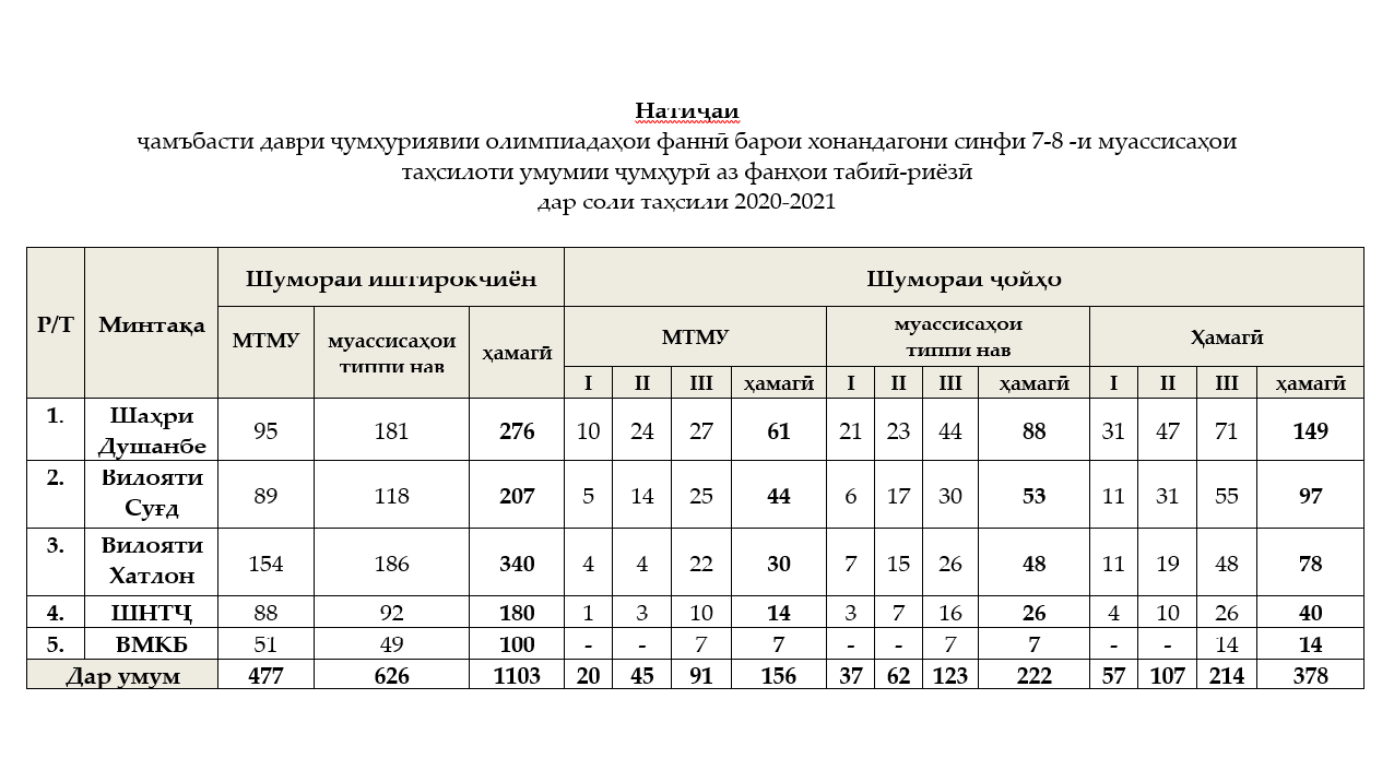 Аз рӯи натиҷаҳо хонандагони муассисаҳои таҳсилоти шаҳри Душанбе бо гирифтани 149 ҷойҳои ифтихорӣ (31 медали тилло, 47 медали нуқра, 71 медали биринҷӣ) соҳиби мақоми аввал гардиданд. Мақоми дуюмро хонандагони муассисаҳои таҳсилоти умумии вилояти Суғд бо гирифтани 97 ҷойи ифтихорӣ (11 медали тилло, 31 медали нуқра, 55 медали биринҷӣ) сазовор шуданд. Ҷои сеюм насиби хонандагони муассисаҳои таҳсилоти умумии вилояти Хатлон бо гирифтани 78 ҷойи ифтихорӣ (11 медали тилло, 19 медали нуқра, 48 медали биринҷӣ) гардид.