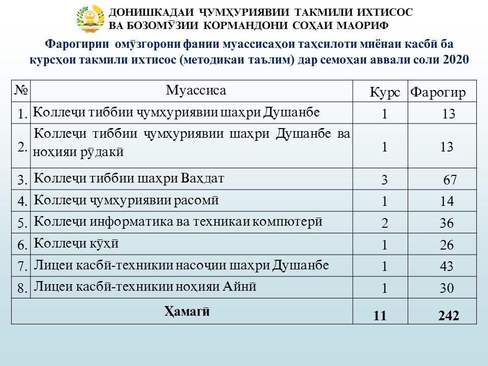 -барои тибқи нақша гузаронидани курсҳои такмили ихтисос ва семинарҳои мақсаднок ва таъмини давомоти шунавандагон, ҳамкории донишкада бо раёсату шуъбаҳои маориф ҷоннок карда шавад.