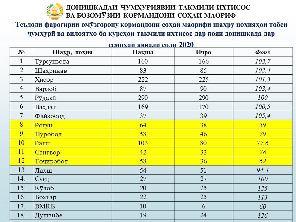 Ҳарчанд масъалаи иҷрои нақшаи фарогирии омӯзгорону кормандони соҳа ба курсҳои такмили ихтисос аз ҷониби шаҳру ноҳияҳо то ҷое ҳалли худро ёфта бошад ҳам, мутаассифона баъзе шаҳру ноҳияҳо ба монанди Рашт, Сангвор, Роғун, Тоҷикобод ва ВМКБ камтар аз 80 фоизро таъмин намудаанд.