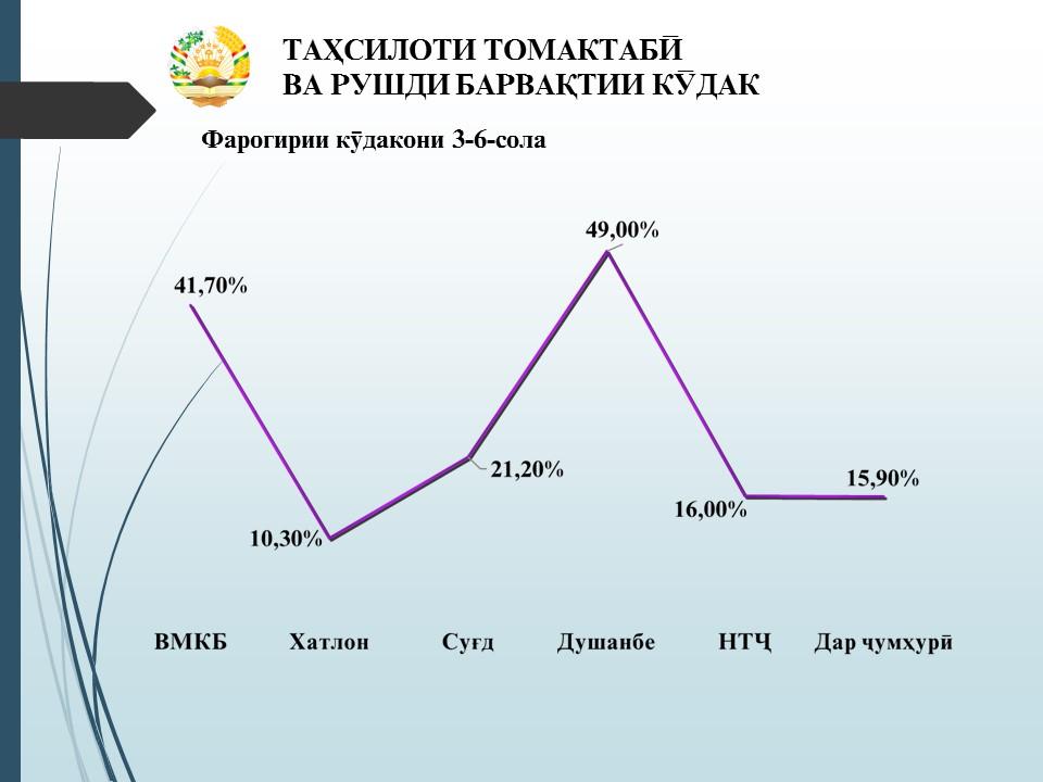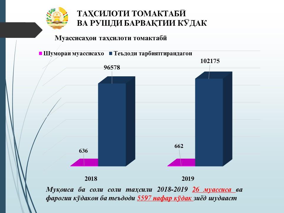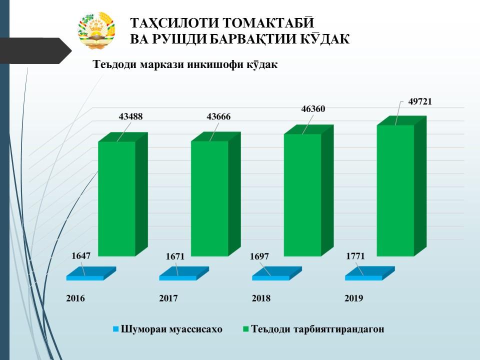 Ин нишондиҳандаҳо дар ҳолест, ки тибқи мактуби дастурии вазорат сардорони раёсат ва мудирони шуъбаҳои маориф муваззаф гардида буданд, ки бо истифода аз шароиту имконоти мавҷуда дар назди муассисаҳои таҳсилоти умумӣ ҳатман марказҳои инкишофи кӯдакро ташкил намуда, ба ин восита дар фарогирии бештари кӯдакон ба таълиму тарбияи томактабӣ саҳмгузорӣ намоянд.