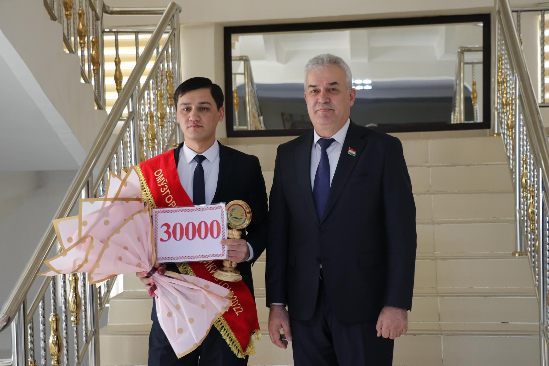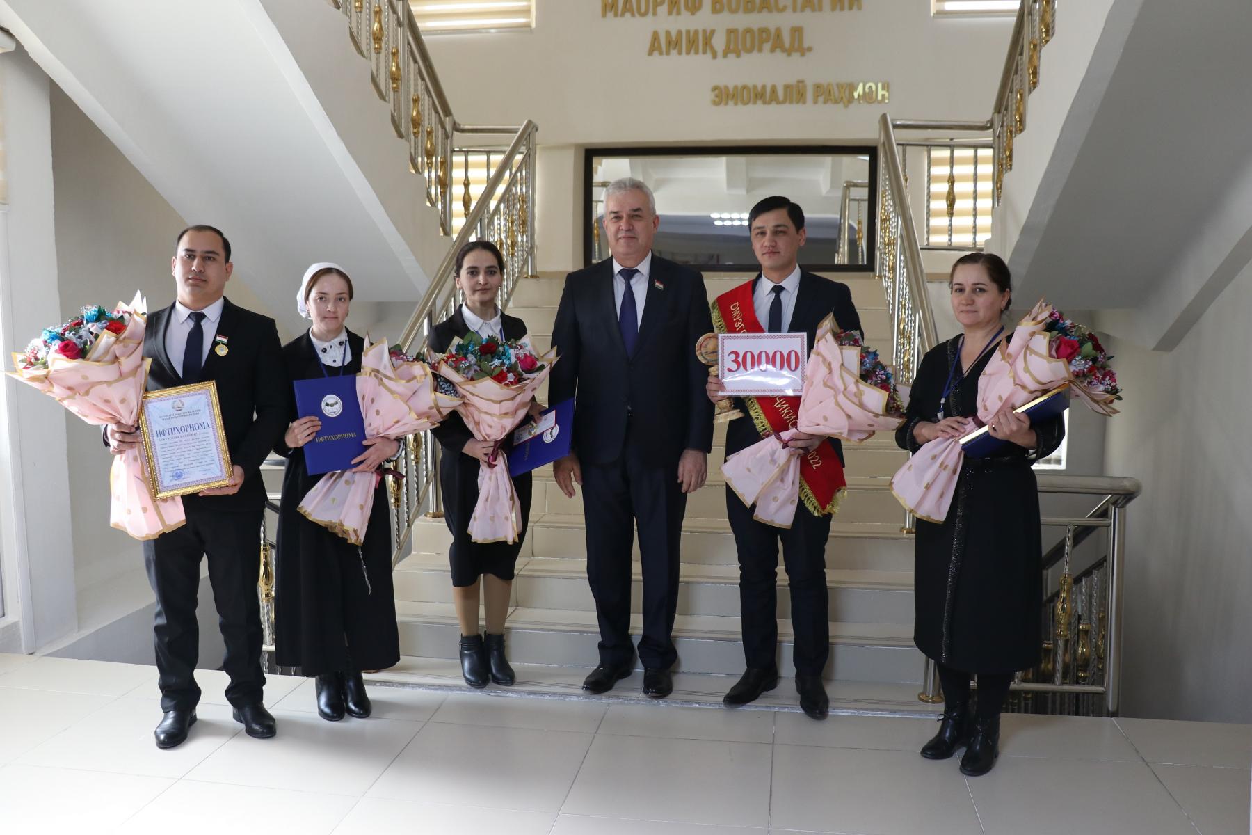 Ҳамчунин, иштирокчиёни озмун: Идиева Азизамоҳ, Оддиева Фарангез бо нишони “Аълочии маориф ва илми Тоҷикистон”, Мамадгаминова Гулнамо ва Ҳукумзода Бахтовар бо “Ифтихорнома”-и Вазорати маориф ва илми Ҷумҳурии Тоҷикистон