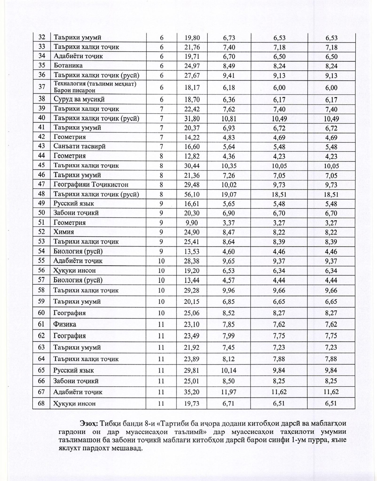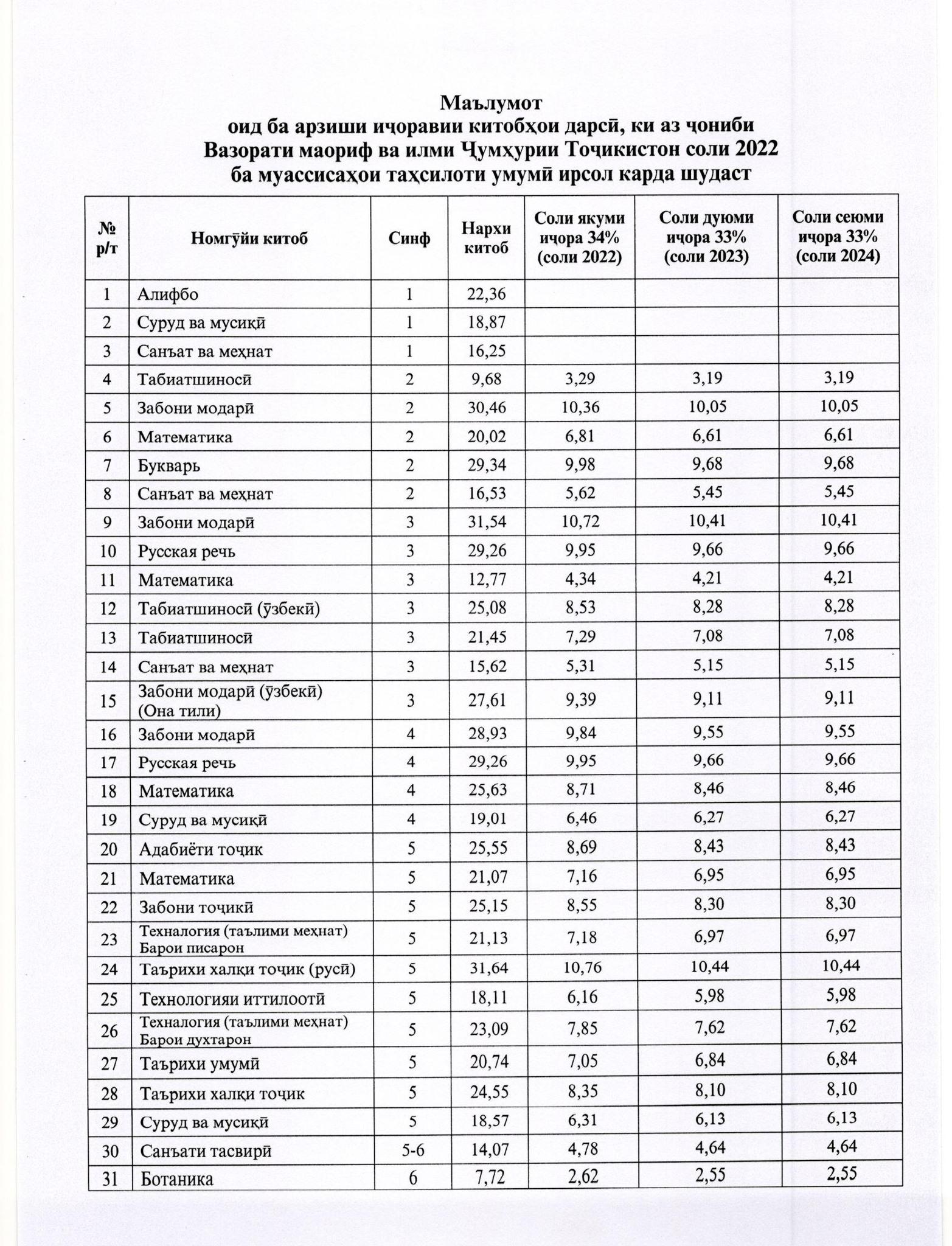 Маълумот оид ба арзиши иҷоравии китобҳои дарсӣ, ки аз ҷониби Вазорати маориф ва илми Ҷумҳурии Тоҷикистон соли 2022 ба муассисаҳои таҳсилоти умумӣ ирсол карда шудаст.
