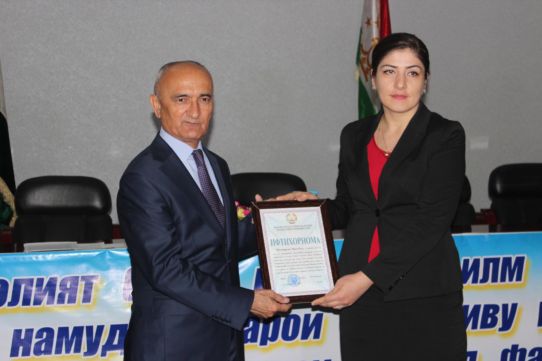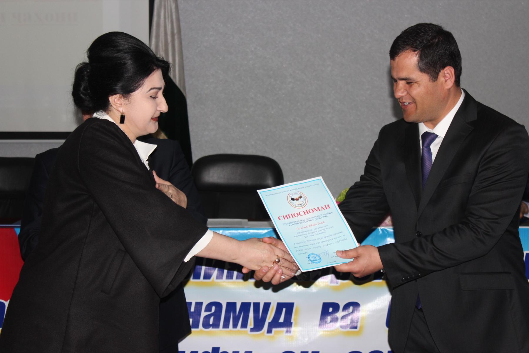 Дар охир ба як қатор кормандони дастгоҳи марказии вазорат, муовинони ректор оид ба илм ва омӯзгорони муассисаҳои таҳсилоти олии касбии кишвар барои саҳми арзанда дар рушди илми тоҷик ифтихорномаҳои Вазорати маориф ва илм, Федератсияи иттифоқҳои касаба ва Иттифоқҳои касабаи кормандони маориф ва илм тақдим карда шуд.