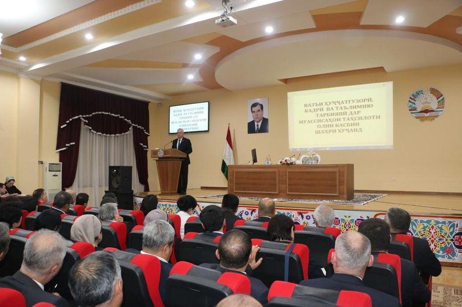 Нахуст вазири маориф ва илм аз дастгириҳои пайвастаи Асосгузори сулҳу ваҳдати миллӣ - Пешвои миллат, Президенти Ҷумҳурии Тоҷикистон муҳтарам Эмомалӣ Раҳмон ёдовар шуда, таъкид намуд, ки омода намудани мутахассисони баландихтисос яке аз вазифаҳои асосие мебошад, ки Пешвои муаззами миллат дар назди мо гузоштаанд. Аз ин рӯ, ин масъала пайваста мавриди таваҷҷуҳи Вазорати маориф ва илм қарор дорад. Маҳз ба ҳамин хотир мо тасмим гирифтем, ки дар ин ҷаласа вазъи иҷрои стратегия ва барномаҳои давлатӣ, қарорҳои ҳайати мушовараи Вазорати маориф ва илм, ҳуҷҷатгузорӣ, вазъи кадрӣ ва таълимию тарбиявии муассисаҳои таҳсилоти олии касбии воқеъ дар шаҳри Хуҷандро мавриди таҳлилу натиҷагирӣ карор диҳем.