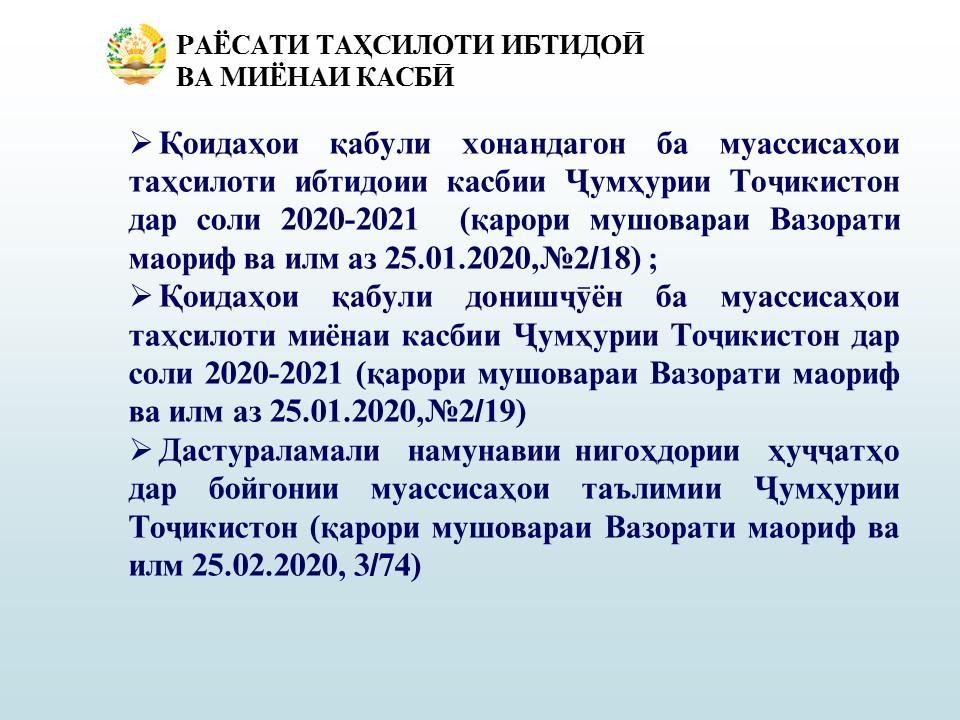Аз ин рӯ, ба директорони муассисаҳои таҳсилоти ибтидоӣ ва миёнаи касбӣ супорида мешавад, ки риояи “Қоидаҳои қабули хонандагон ба муассисаҳои таҳсилоти ибтидоии касбии Ҷумҳурии Тоҷикистон дар соли 2020-2021 ва “Қоидаҳои қабули донишҷӯён ба муассисаҳои таҳсилоти миёнаи касбии Ҷумҳурии Тоҷикистон дар соли 2020-2021”-ро таъмин намуда, тарғибу ташвиқи муассисаҳои таълимиро тариқи воситаҳои ахбори омма, ролику дискҳо, гузаронидани рӯзҳои дарҳои кушод ва вохӯрӣ бо хатмкунандагон дар муассисаҳои таҳсилоти умумиро ба роҳ монда, ҷиҳати ҷалби хатмкунандагон ба муассисаҳои таҳсилоти ибтидоӣ ва миёнаи касбӣ шароити мусоидро фароҳам оваранд.