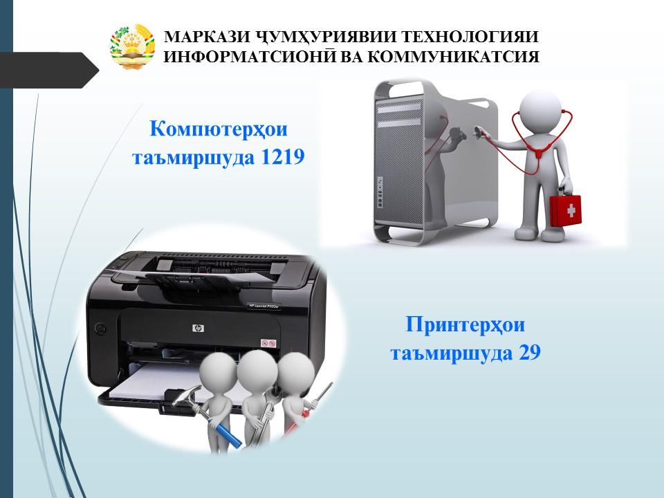 Ҳамзамон, Марказ ҷиҳати дар ҳолати корӣ нигоҳ доштани таҷҳизоти технологияҳои иттилоотию-коммуникатсионӣ дар муассисаҳои таълимӣ 1219 компютер ва 29 принтерро таъмир намуда, 74 адад тахтаҳои электронӣ ва проекторҳоро бо барномаҳои махсус насб ва ба ҳолати корӣ барқарор намуд. Айни замон тамоми муассисаҳои таълимӣ бо барнома ва китобҳои дарсии электронӣ бо забони давлатӣ таъмин мебошанд.