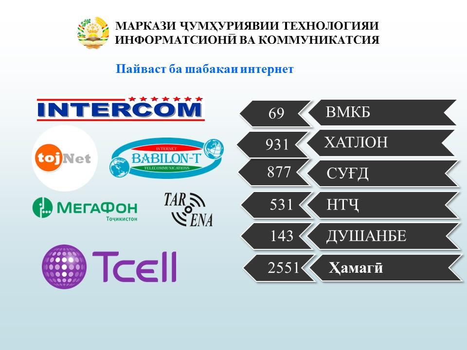 Бояд қайд намуд, ки 2551 муассисаи таҳсилоти миёнаи умумии ҷумҳурӣ ба шабакаи Интернет пайваст карда шудаанд, ки қисми зиёди онҳо ба воситаи WiFi - модем буда, 524 адад кабинети технологияи иттилоотӣ шабакаи дохилӣ (локалӣ) доранд.