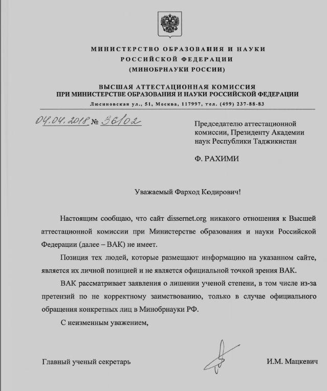 Зимни ин нома ба маълумоти Шумо мерасонам, ки сомонаи dissernet.org ба Комиссияи олии аттестатсионии назди Вазорати маориф ва илми Федератсияи Россия (минбаъд – КОА) ягон муносибат надорад.