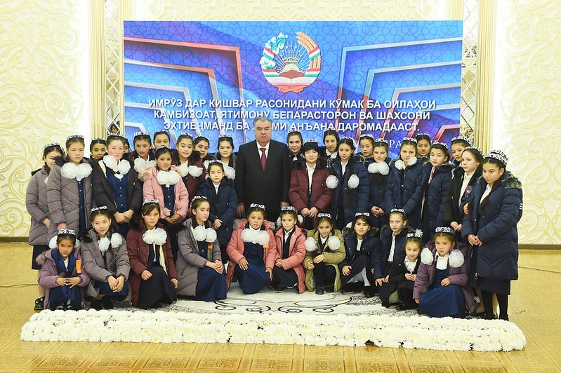 Ятимон бо шодию нишот аз дасти Сарвари раъийятпарвару инсондӯсти мамлакат либоси мактабӣ, пойафзол, шириниҳо ва кӯмаки молӣ туҳфа гирифтанд.