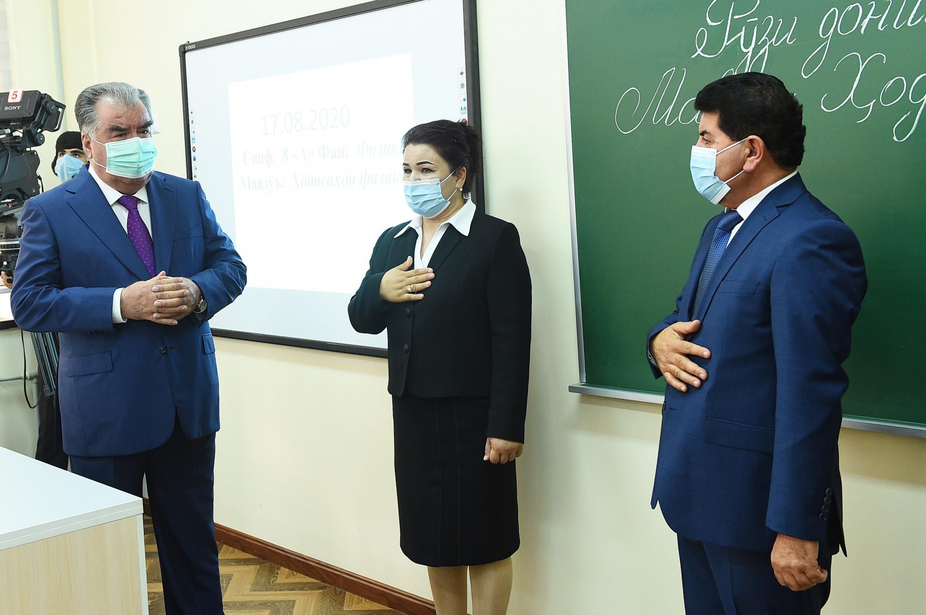 Баъди бардоштани парда аз рӯи лавҳаи рамзӣ Пешвои миллат бо шароити таълимгоҳ шинос шуда, бо хонандагону омӯзгорон сӯҳбати самимӣ доир карданд.