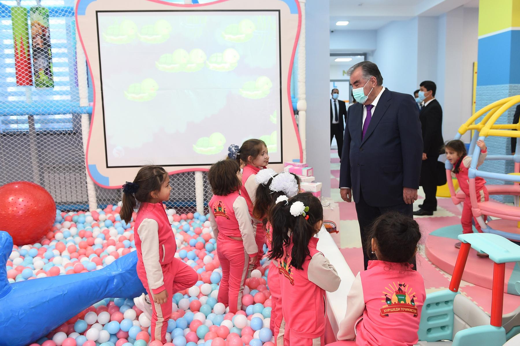 Аснои шиносоӣ ба Сарвари давлат муҳтарам Эмомалӣ Раҳмон имкониятҳои ҳуҷраҳо муаррифӣ гардида, иттилоъ дода шуд, ки ба хотири таъмини шароити арзандаи таълиму тарбияи кӯдакон, барои машғулияти кӯдакон синфхонаҳо бо муосиртарин асбобу аёният муҷаҳҳаз шудааст.