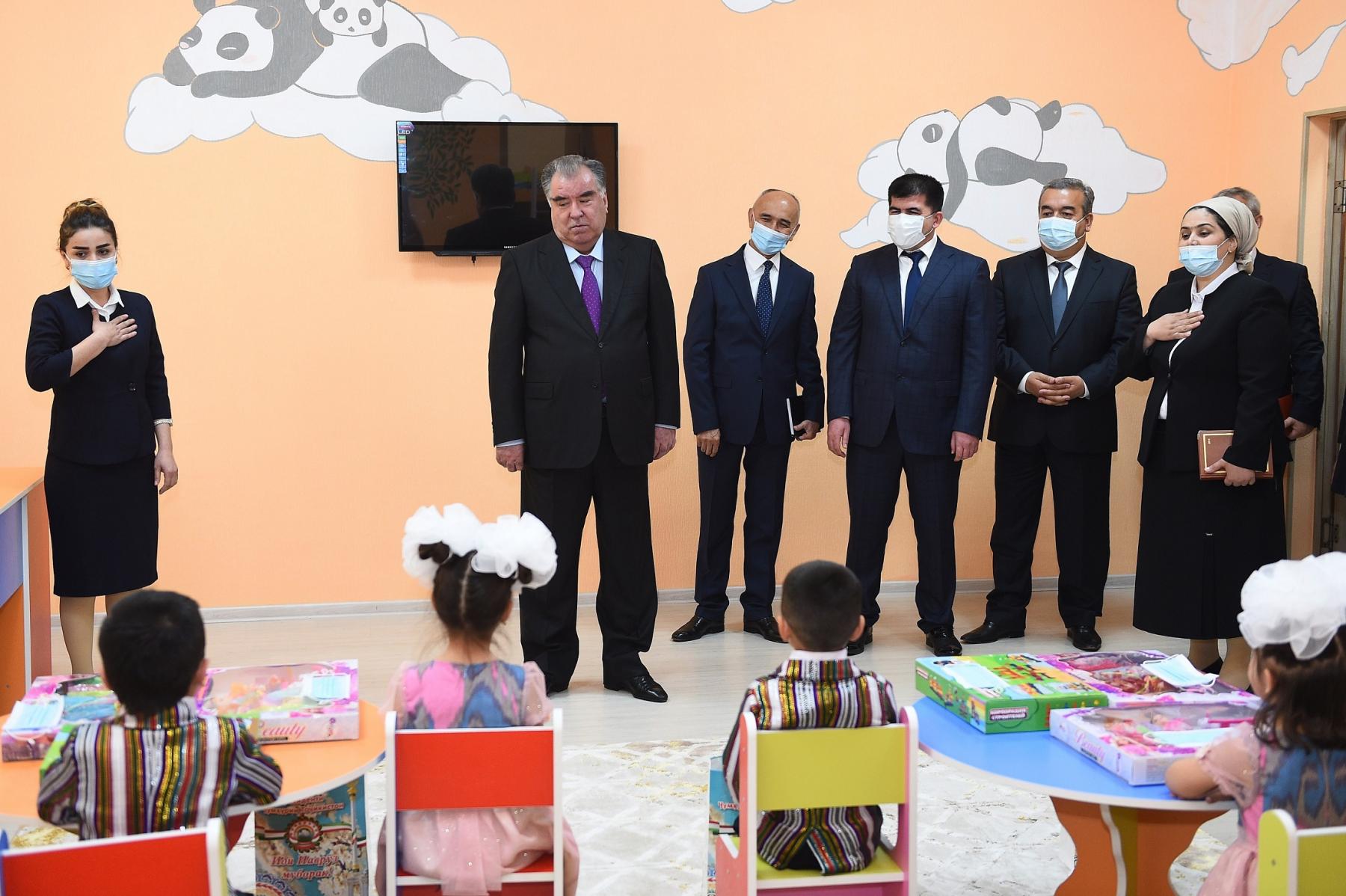 Сарвари давлат муҳтарам Эмомалӣ Раҳмон аз утоқҳои машғулиятҳо ва ҷойи хобу истироҳати кӯдакон дидан намуда, ба масъулони боғчаи бачагона ҷиҳати тарбияи дурусти кӯдакон дастуру маслиҳатҳои муфид доданд.