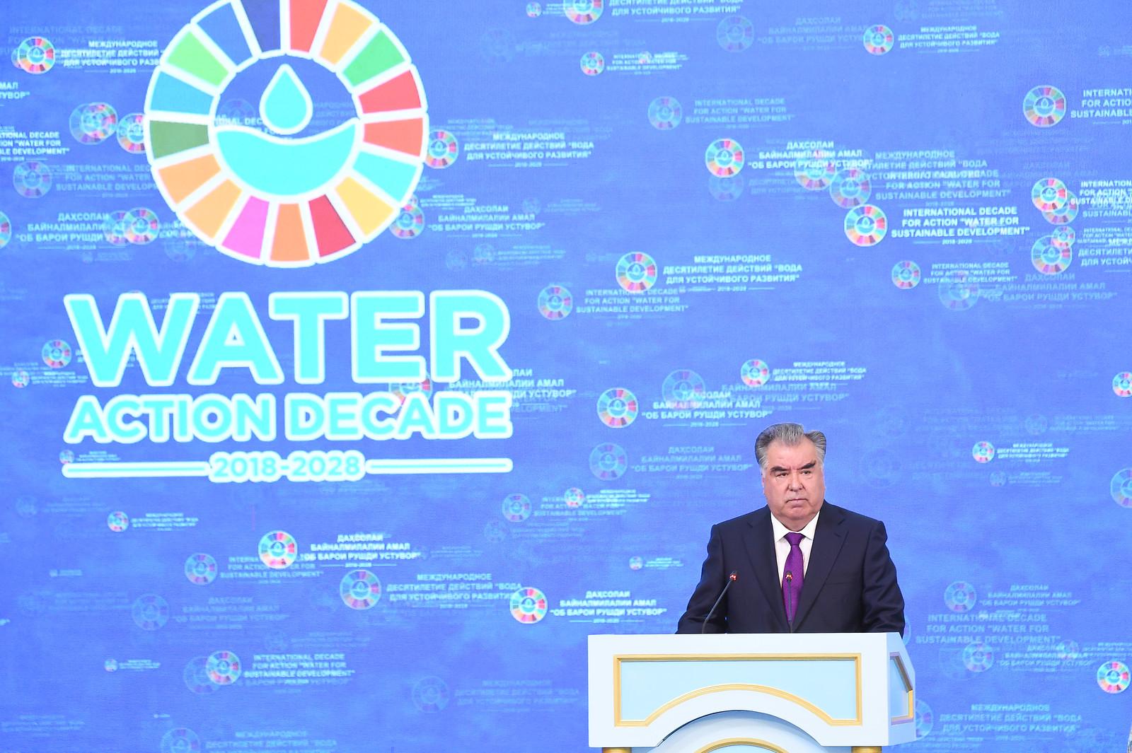 Президенти мамлакат муҳтарам Эмомалӣ Раҳмон аз таърихи 20 соли талошҳову ташаббусҳо оид ба ҳалли мушкилоти об дар сайёра ёдовар шуда, таъкид доштанд, ки ташаббусҳои ҷаҳонии “Соли байналмилалии оби тоза - 2003”, Даҳсолаи байналмилалии амал “Об барои ҳаёт, 2005 - 2010” ва “Соли байналмилалии ҳамкорӣ дар соҳаи об - 2013” ба ҳамкории фаъоли ҳамаи ҷонибҳои манфиатдор дар самти мудирияти оқилонаи захираҳои об ва татбиқи лоиҳаҳо дар соҳаи об, инчунин, дар амалисозии фанноварию навовариҳои муосир мусоидат намуданд.