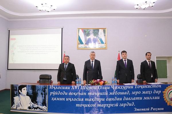 14-уми ноябри соли ҷорӣ бо ибтикори Вазорати маориф ва илми Ҷумҳурии Тоҷикистон дар толори Донишкадаи ҷумҳуриявии такмили ихтисос ва бозомӯзии кормандони соҳаи маориф бахшида ба 30-солагии Иҷлосияи XVI-уми Шурои Олии Ҷумҳурии Тоҷикистон таҳти унвони “Нақши Иҷлосияи сарнавиштсоз дар рушди илму маорифи кишвар” конференсияи илмӣ-назариявӣ баргузор гардид, ки дар он муовини вазири маориф ва илм Зиёдулло Абдулзода, сардорону кормандони раёсат, шуъба, бахши дастгоҳи марказӣ ва муассисаҳои тобеи вазорат, инчунин, омӯзгорони як қатор муассисаҳои таҳсилоти олии касбӣ иштирок ва суханронӣ намуданд.