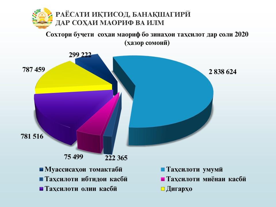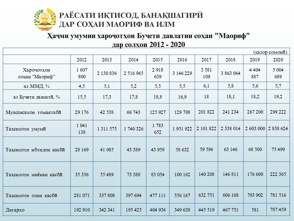 Соли 2020 барои соҳаи маориф 5 млр. 4 млн. 653 ҳазор сомонӣ ҷудо карда шудааст, ки нисбат ба соли 2019 13,6 % зиёд мебошад.