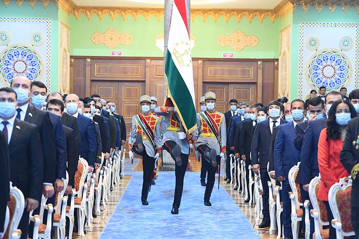 Дар ин вақт Парчами давлатии Ҷумҳурии Тоҷикистон ва Ливои Президенти Ҷумҳурии Тоҷикистон аз ҷониби афсарону сарбозони Горди миллии Ҷумҳурии Тоҷикистон, ки либосҳои идонаи низомӣ ва шамшерҳои аз ниём кашида доштанд, ба толор зери оҳанги мутантани фахрӣ ва марши махсус ворид карда шуд.