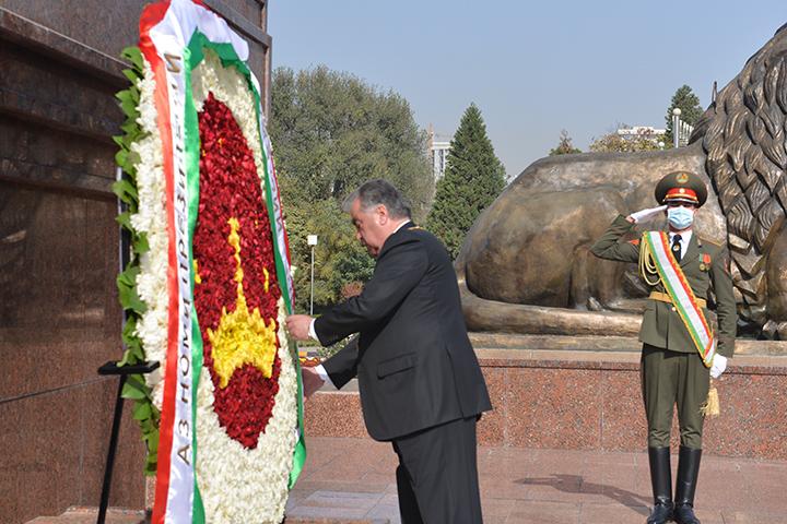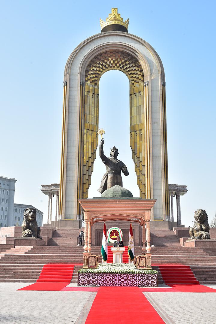 Баъди гузоштани гулчанбар ва лаҳзаи хомӯшӣ Президенти Ҷумҳурии Тоҷикистон муҳтарам Эмомалӣ Раҳмон ҳамчун рамзи эҳтиром ба таърихи пурифитихори давлатдории миллӣ бо нимтаъзим ба Муҷассамаи Ваҳдати миллӣ ва эҳёи Тоҷикистон эҳтиром ба ҷо оварданд.