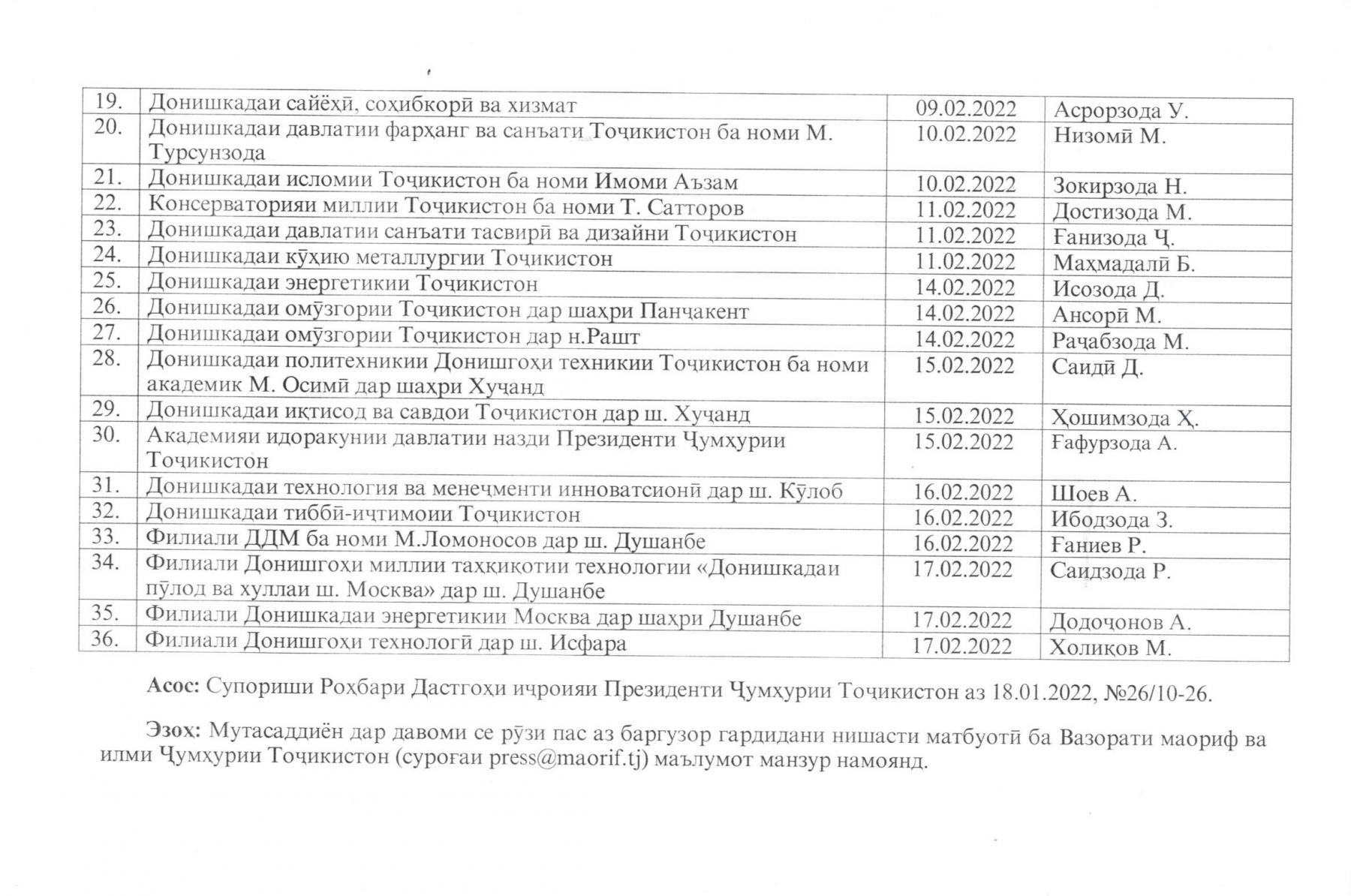 Нақшаи ташкил ва гузаронидани нишастҳои матбуотӣ дар муассисаҳои таҳсилоти олии касбӣ оид ба ҷамъбасти соли 2021