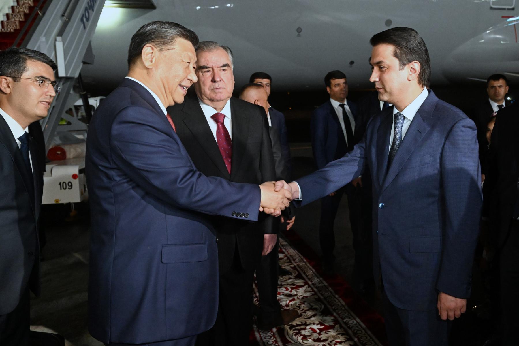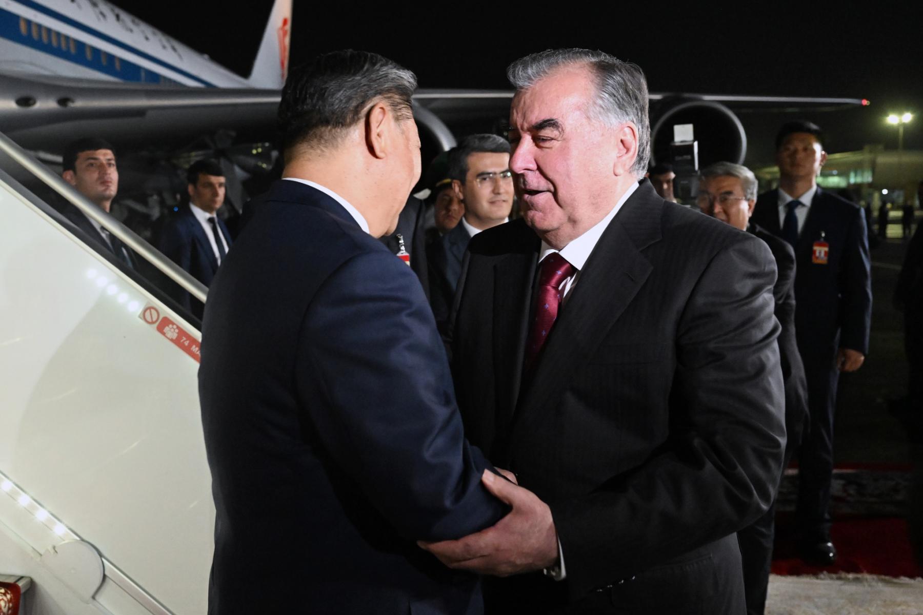 Асосгузори сулҳу ваҳдати миллӣ - Пешвои миллат, Президенти Ҷумҳурии Тоҷикистон муҳтарам Эмомалӣ Раҳмон бо нишони эҳтироми баланд меҳмони олимақом - Раиси Ҷумҳурии Мардумии Чин муҳтарам Си Ҷинпинро гарму самимӣ истиқбол гирифтанд.