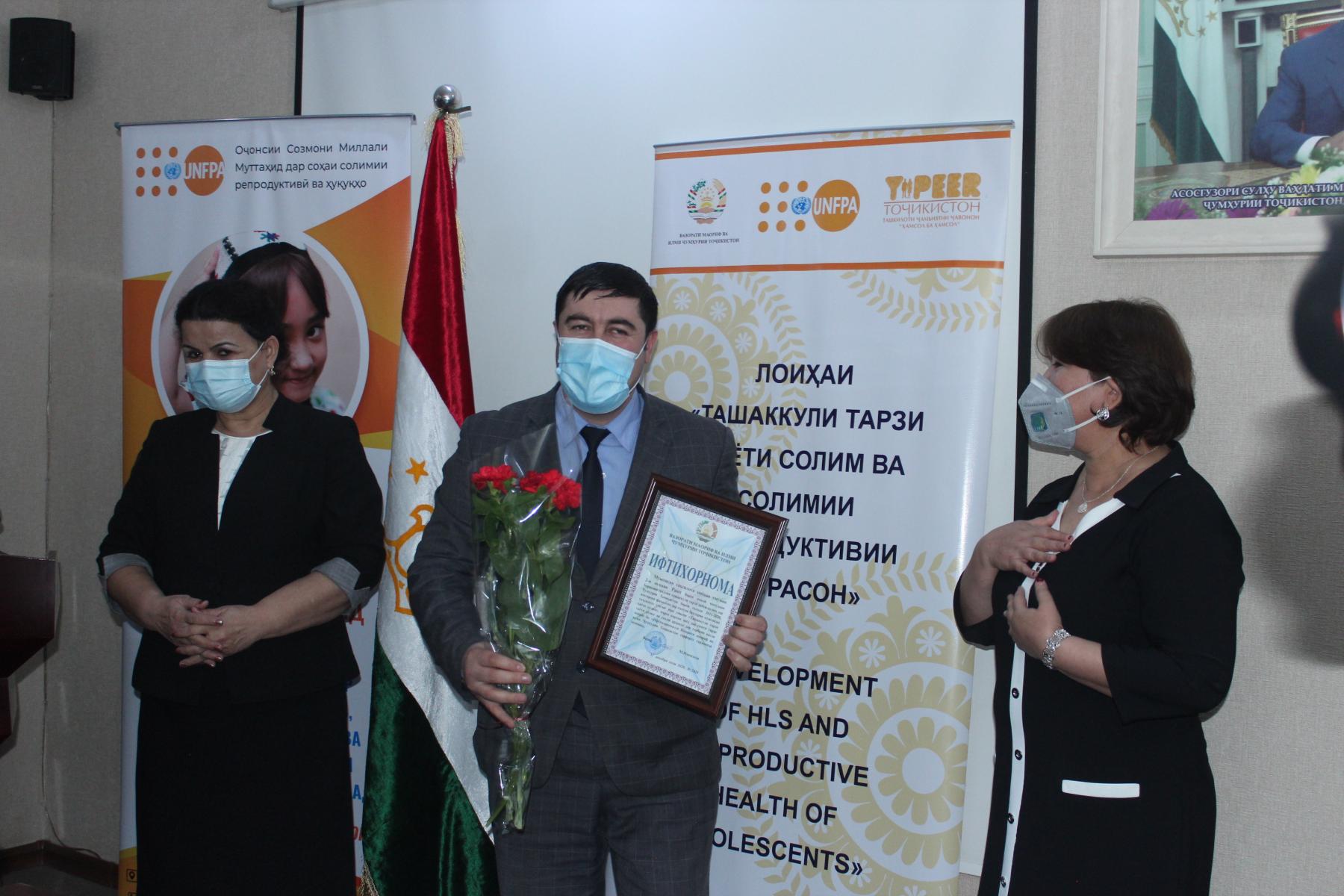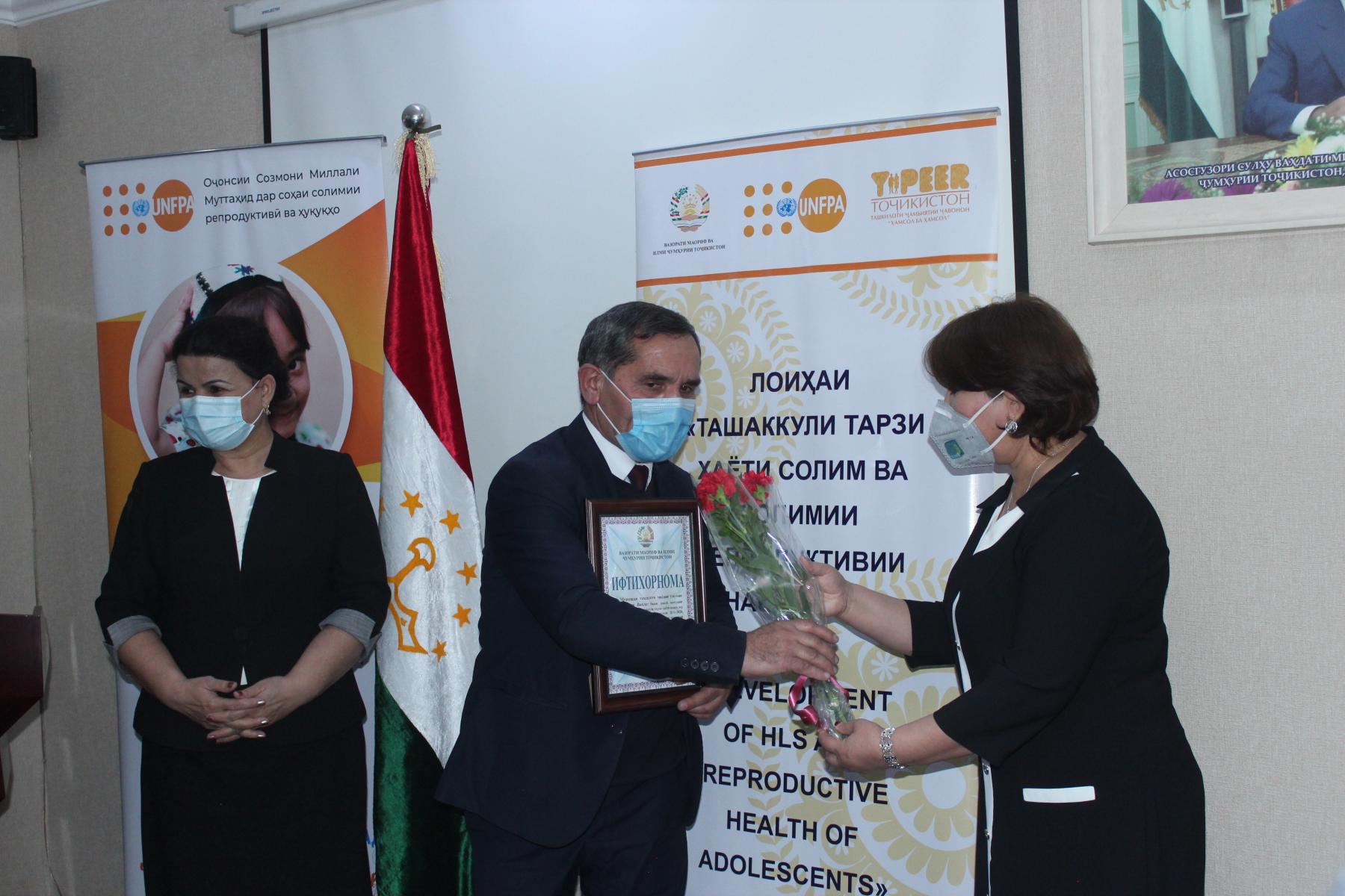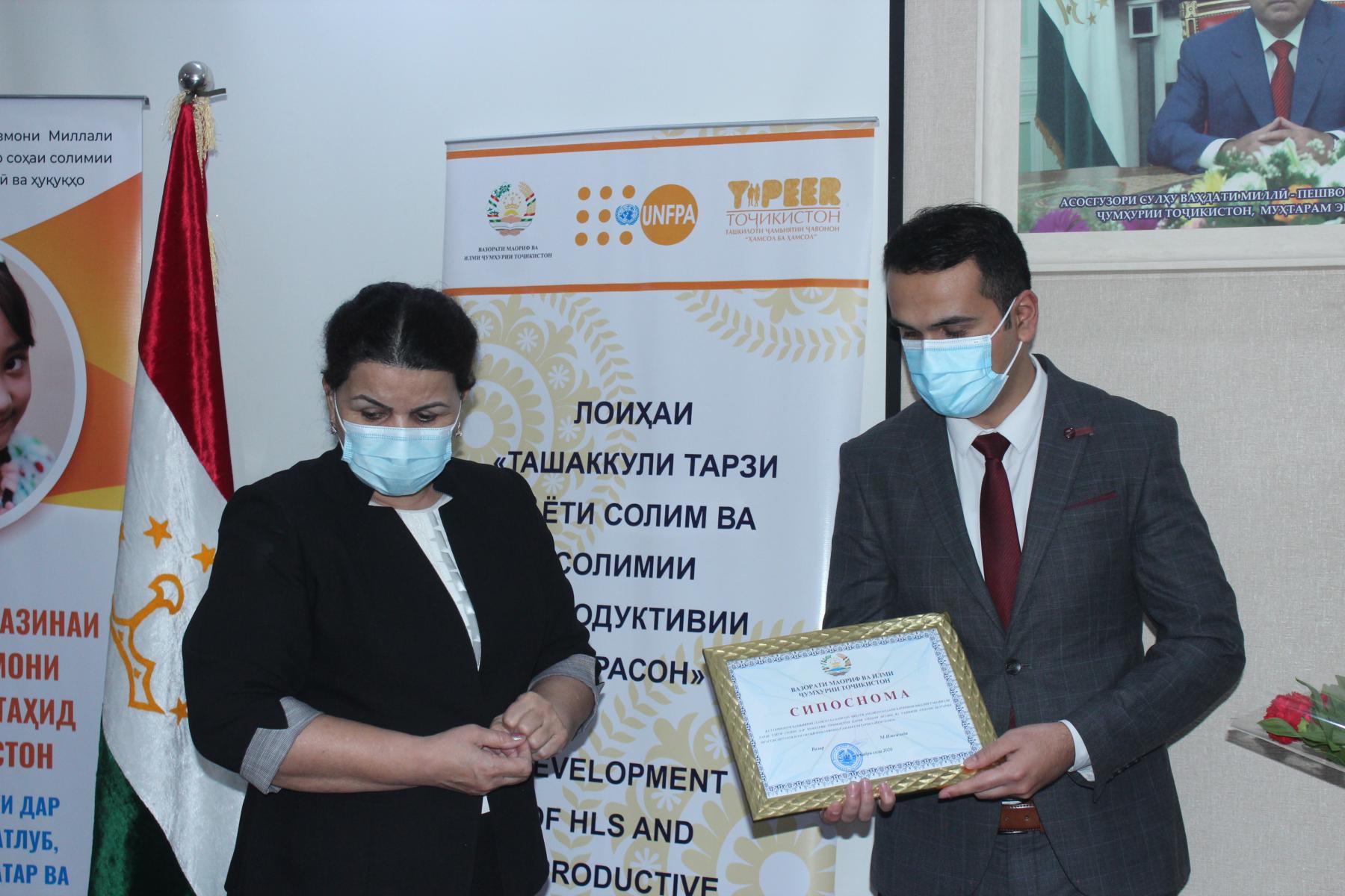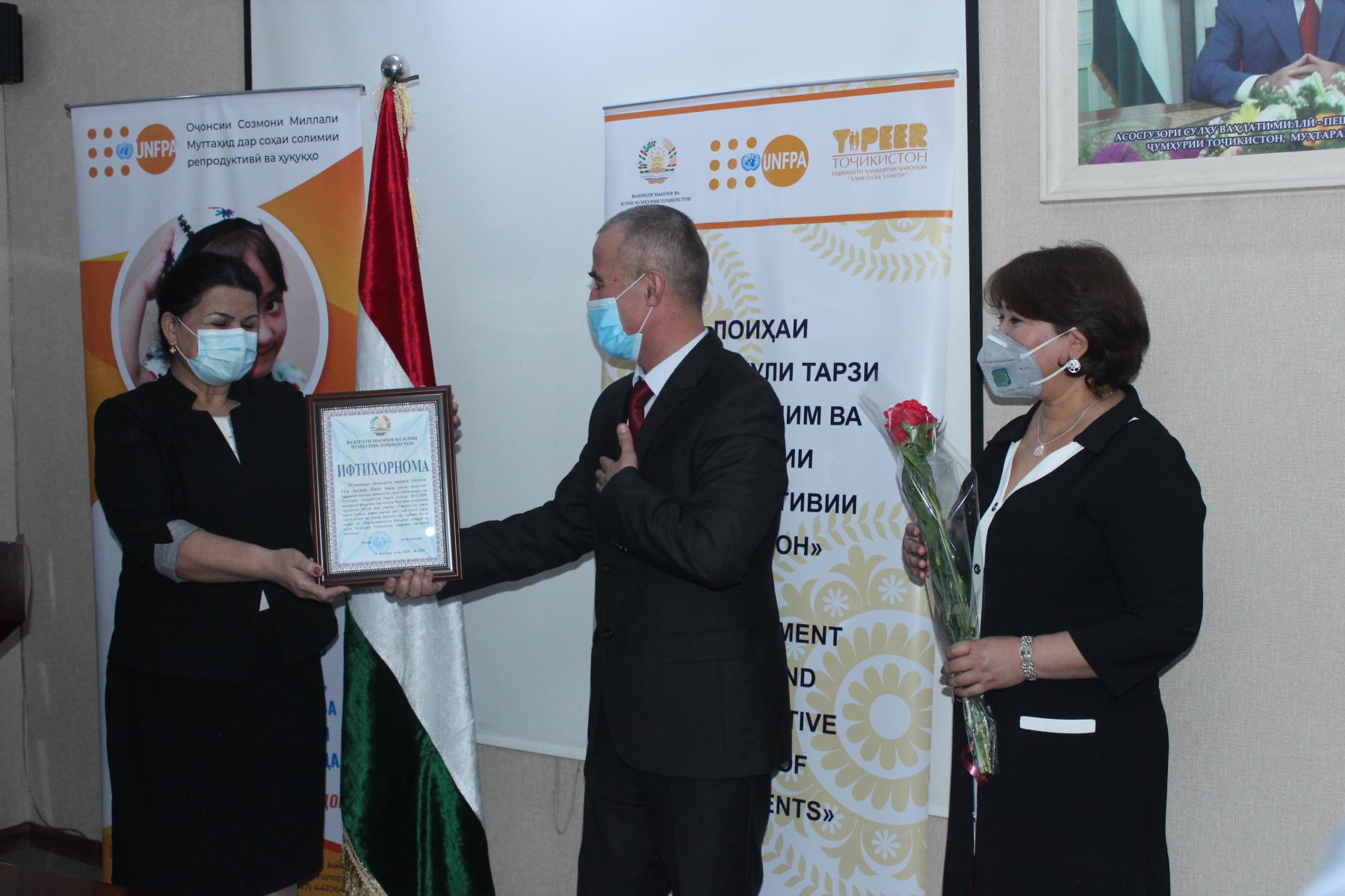 25-уми декабри соли ҷорӣ дар Вазорати маориф ва илми Ҷумҳурии Тоҷикистон бо иштироки Латофат Назирӣ-муовини вазири маориф ва илм, намояндагони Хазинаи нуфуси аҳолии Созмони Милали Муттаҳид (ЮНФПА) ва ташкилоти ҷамъиятии “Ҳамсол ба ҳамсол” маросими туҳфасупорӣ ба ғолибони озмуни беҳтарин муассисаи таҳсилоти умумӣ зери унвони «Ташаккули тарзи ҳаёти солим» баргузор гардид.