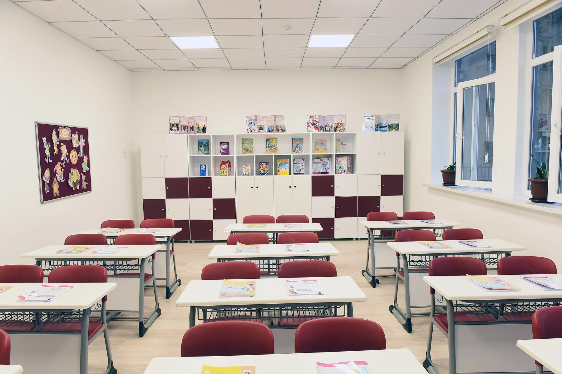 Дар ошёнаи якуми бинои мактаб синфхонаи компютерӣ, маҳфили эҷодӣ ва 2 синфхонаи таълимӣ ҷойгир буда, 6 синфхонаи дигар дар ошёнаи дуюм мавҷуданд. Китобхона ва синфхонаи шоҳмот дар ошёнаи сеюм ҷойгир мебошанд.