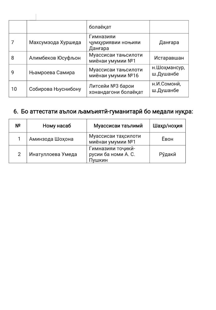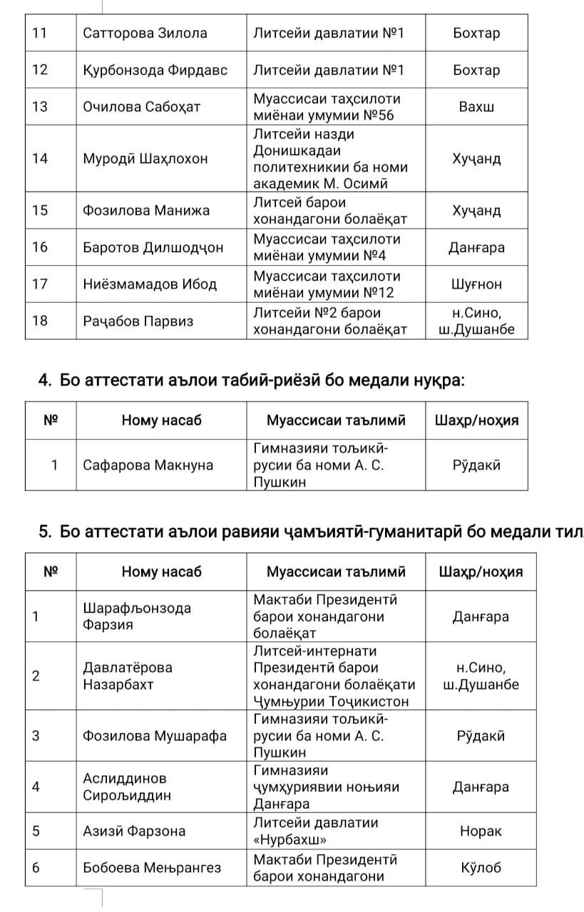 РӮЙХАТИ ҒОЛИБОНИ ОЗМУНИ АТТЕСТАТИ АЪЛОИ УНИВЕРСАЛӢ ВА АТТЕСТАТИ АЪЛО АЗ РЎЙИ РАВИЯҲО