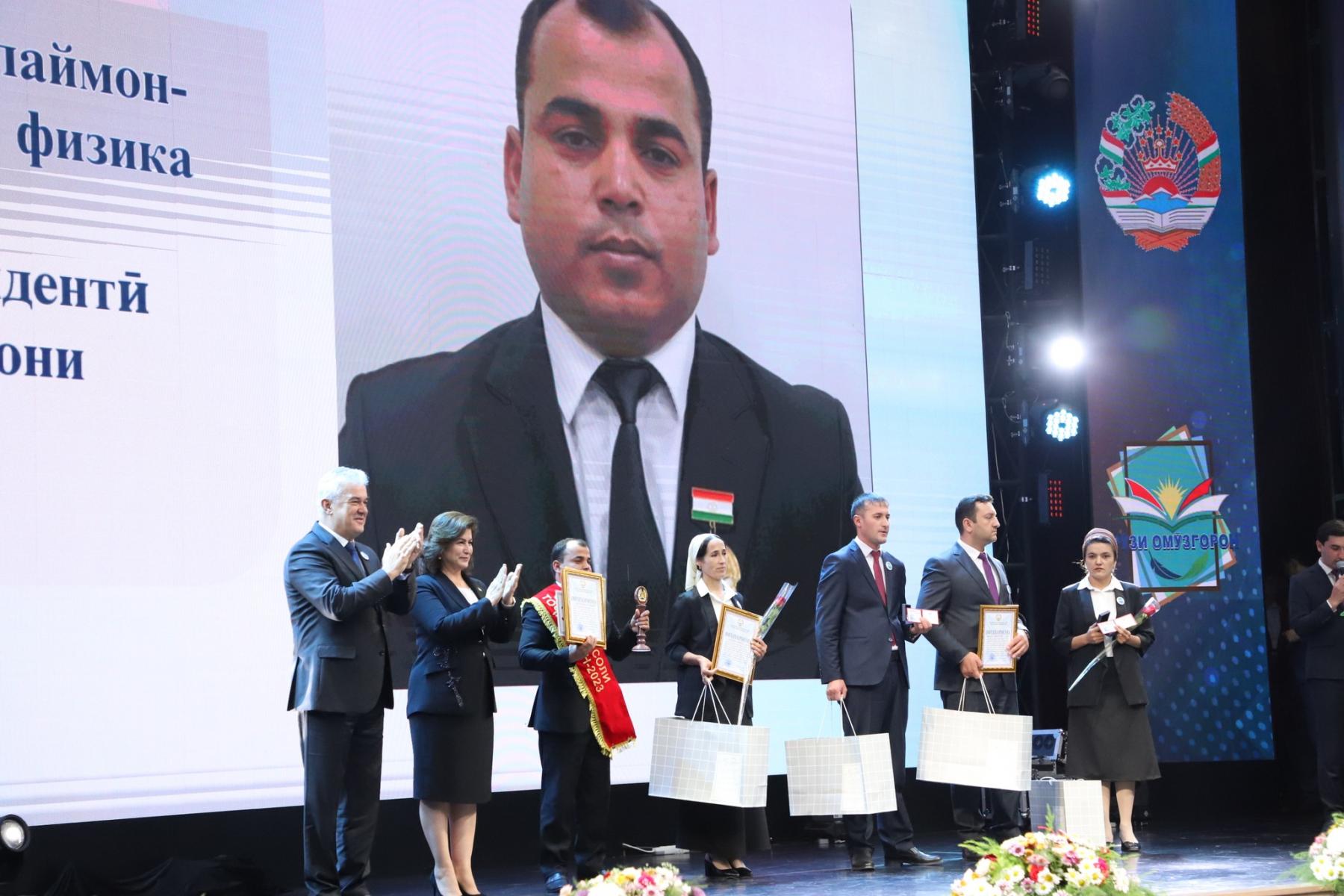 Сипас маросими ҷоизасупорӣ ба ғолибони озмунҳои касбӣ ва сарфарозгардонии омӯзгорони дар фаъолияти худ дорои натиҷаҳои назаррас бо мукофотҳои соҳавӣ баргузор гардида, аз ҷониби муовини Сарвазири кишвар Матлубахон Сатториён ва вазири маориф ва илм Раҳим Саидзода иштирокчиёни озмунҳои ҷумҳуриявии “Омӯзгори соли Тоҷикистон - 2023” ва “Мураббии соли Тоҷикистон - 2023” бо нишони “Аълочии маориф ва илми Ҷумҳурии Тоҷикистон” ва ғолибони ин озмунҳо бо диплом ва мукофотпулӣ дар ҳаҷми 30 000 сомонӣ ва 10 000 сомонӣ мукофотонида шуданд.