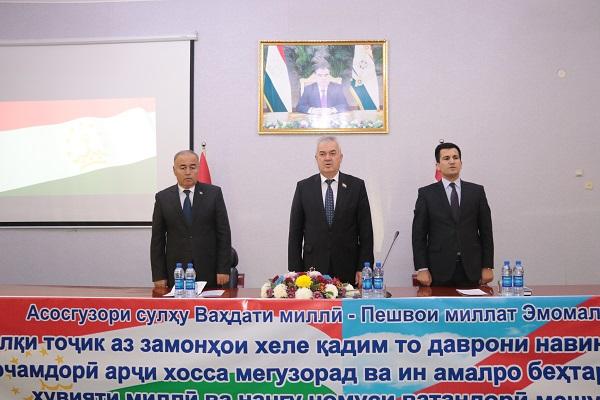 Конференсия бо садо додани Суруди миллии Ҷумҳурии Тоҷикистон оғоз гардида, вазири маориф ва илм ҳозиринро ба Рӯзи Парчами давлатӣ табрику таҳният гуфта, ҳамзамон, қайд намуд, ки Парчам рамзи озодии миллат, ифтихори миллӣ ва ҳисси баланди меҳандӯстиву хештаншиносӣ ба шумор меравад.