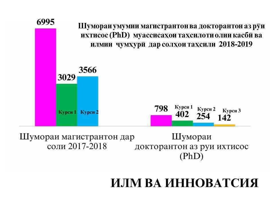 Айни замон, дар 23 муассисаи илмӣ ва таҳсилоти олии касбии ҷумҳурӣ 798 нафар дар зинаи докторантура аз рӯи ихтисос (PhD) таҳсил менамояд, ки дар қиёс ба соли 2017 313 нафар зиёд мебошад. Дар баробари ин, 1 230 нафар дар шуъбаи рӯзона ва ғоибонаи аспирантура дар муассисаҳои таҳсилоти олии касбӣ ва илмӣ таҳсил доранд.