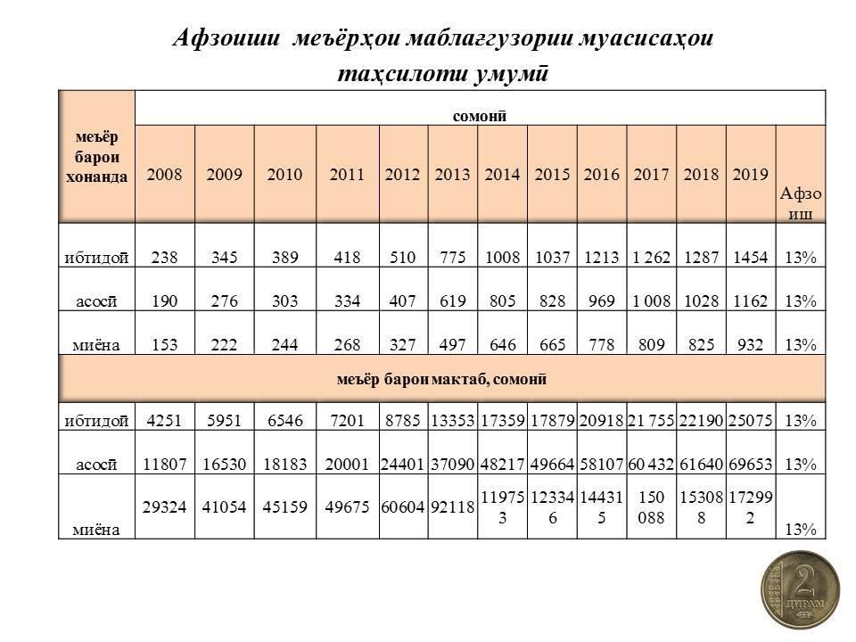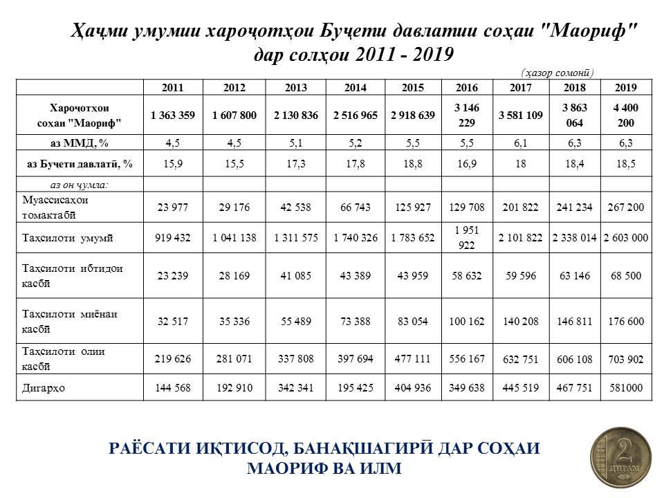 Рушди устувор ва самаранокии ислоҳоти соҳаи маориф аз афзоиши маблағгузории он вобастагӣ дорад. Аз тарафи Ҳукумати Ҷумҳурии Тоҷикистон бо сарварии Президенти кишвар ба соҳаи маориф таваҷҷуҳи хосса зоҳир гардида, маблағгузории ин соҳаи калидӣ ва ҳаётан муҳим сол аз сол зиёд мегардад. Аз ҷумла, соли 2018 барои соҳаи маориф 3 млрд. 863 млн. 64 ҳазор сомонӣ ҷудо карда шуд, ки нисбат ба соли 2017 8% зиёд мебошад.